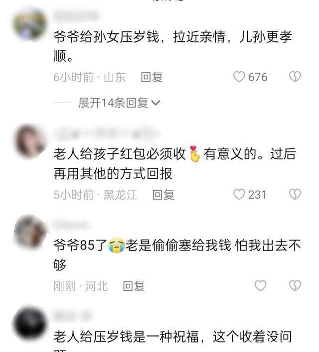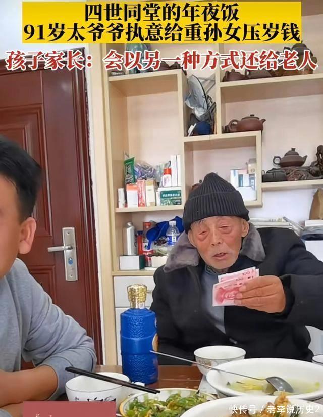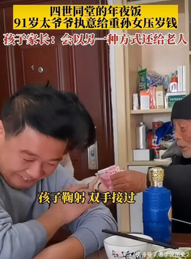 妈妈看到女儿犹豫,也轻轻摇头,示意她谢绝太爷爷的好意,并告诉她,考虑到太爷爷的高龄,还是让老人家把钱留着。 重孙女很乖巧,立刻表示自己不能接受,谢绝了太爷爷的好意。看到这一幕,太爷爷笑着表示:这没什么的,你是我重孙女,收下这些压岁钱很正常,这是我对你的祝福,不用太客气。 其他长辈也纷纷劝解道:这是太爷爷的心意,收下吧。家里就一个小孩,长大了要好好照顾太爷爷。 尽管大人们都这样说,但重孙女还是有些犹豫。这时,爸爸轻声在妈妈旁边说:先收着,以后会以另一种方式回报给太爷爷的。 妈妈听了之后,觉得爸爸说得有道理,最终同意了这个建议。